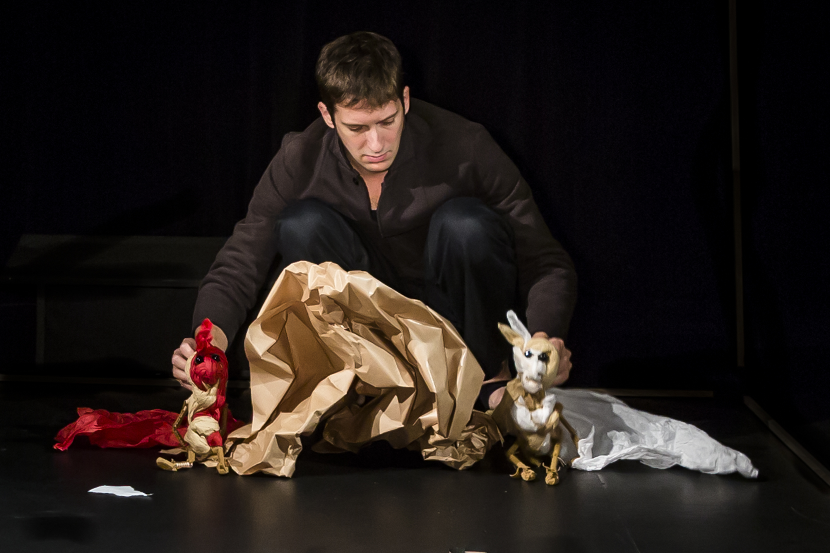 Un manipulateur déroule d’autres feuilles de papier, dessinant un univers archaïque. Le public assiste à une transformation.